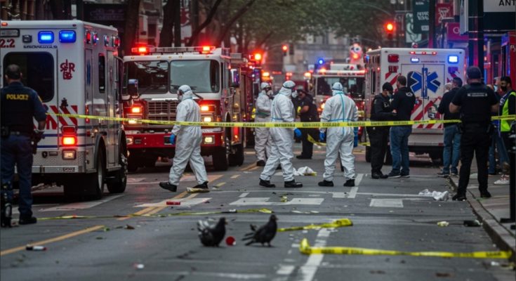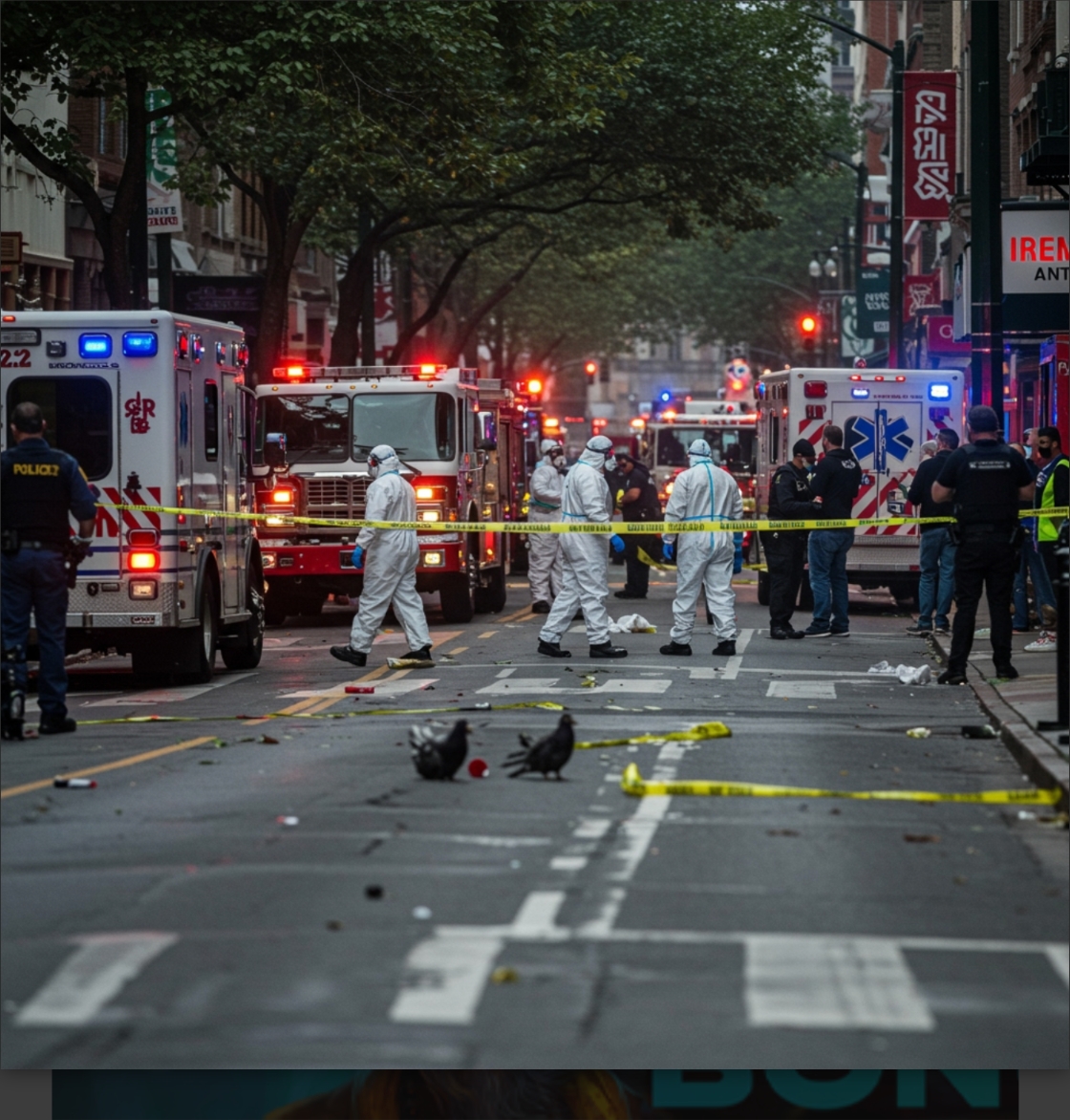 In the wake of an unimaginable event that has struck the heart of the city, a solemn and stark scene unfolds on what were moments ago bustling streets. Emergency responders, clad in full hazardous materials (hazmat) suits, are undertaking the grim and necessary task of recovering and transporting victims. The bright, protective gear stands in sharp contrast to the somber mood and the gravity of the situation.