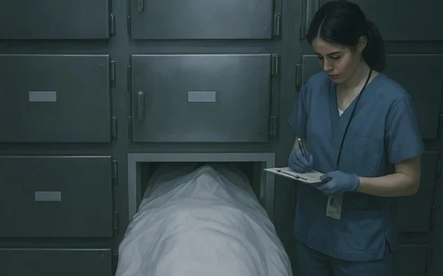 That night, she was the only one on duty in the morgue. Routine kept her steady: logging arrivals, checking identification tags, filling in the register. Around two in the morning, paramedics delivered a middle-aged man with no documents — found unconscious in an apartment, declared in cardiac arrest on the way. Straight to the morgue he went.